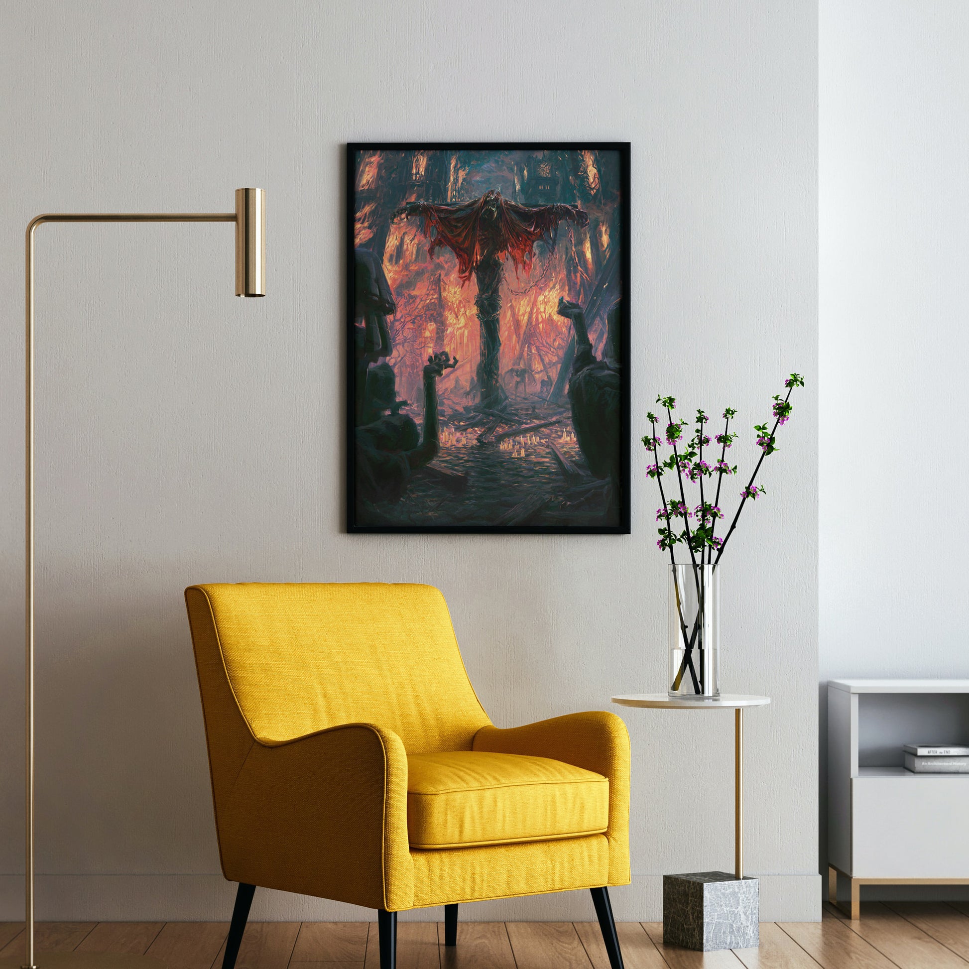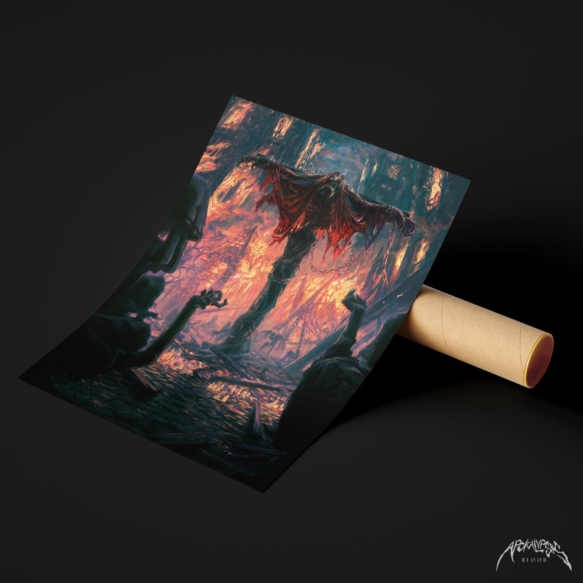 Il poster è dedicato all’artwork del Capitolo 0: Tempo. L’illustrazione raffigura in tutta la sua crudezza la tragedia di Old Yharnam, data alle fiamme dalla Chiesa della Cura per contrastare l’inarrestabile piaga delle belve.