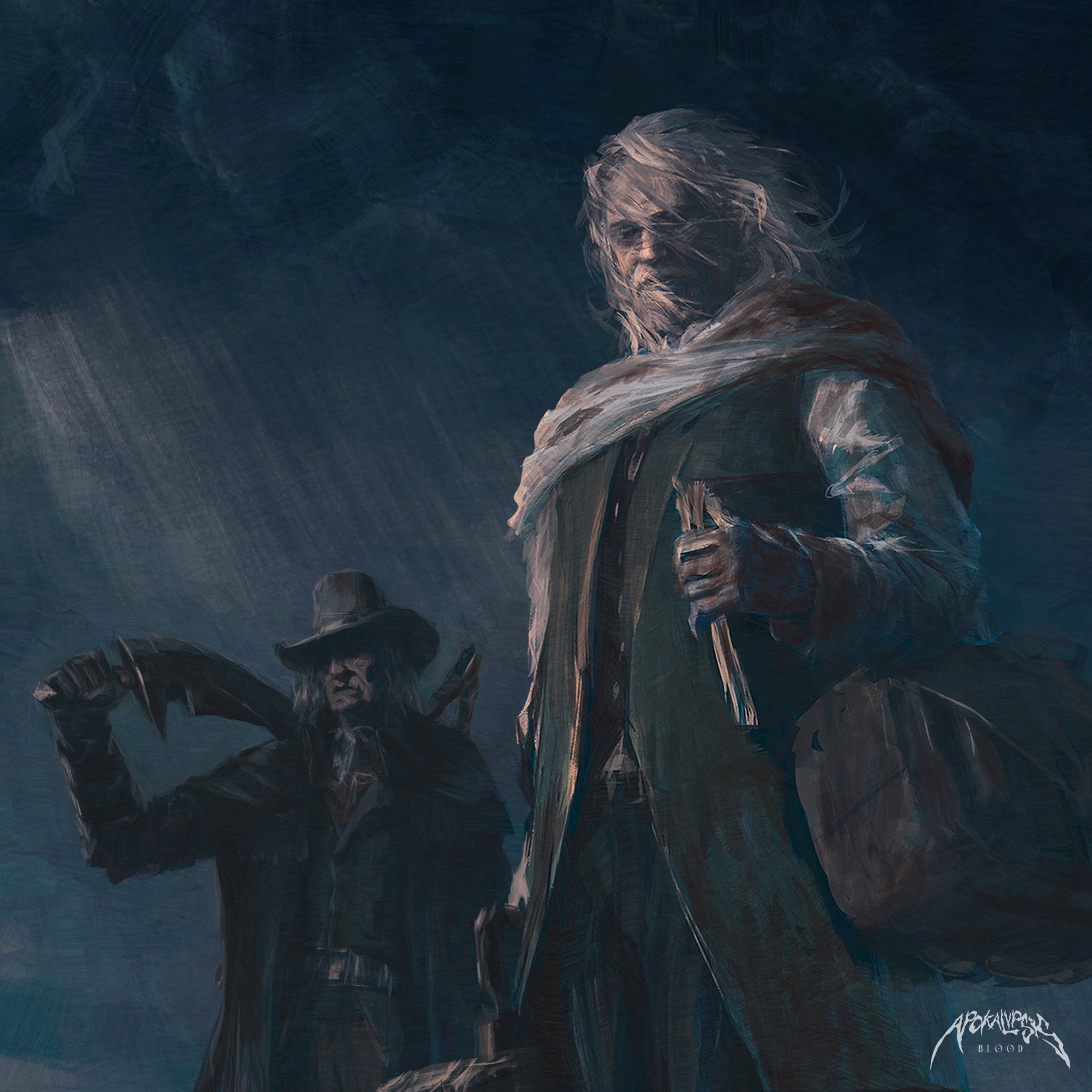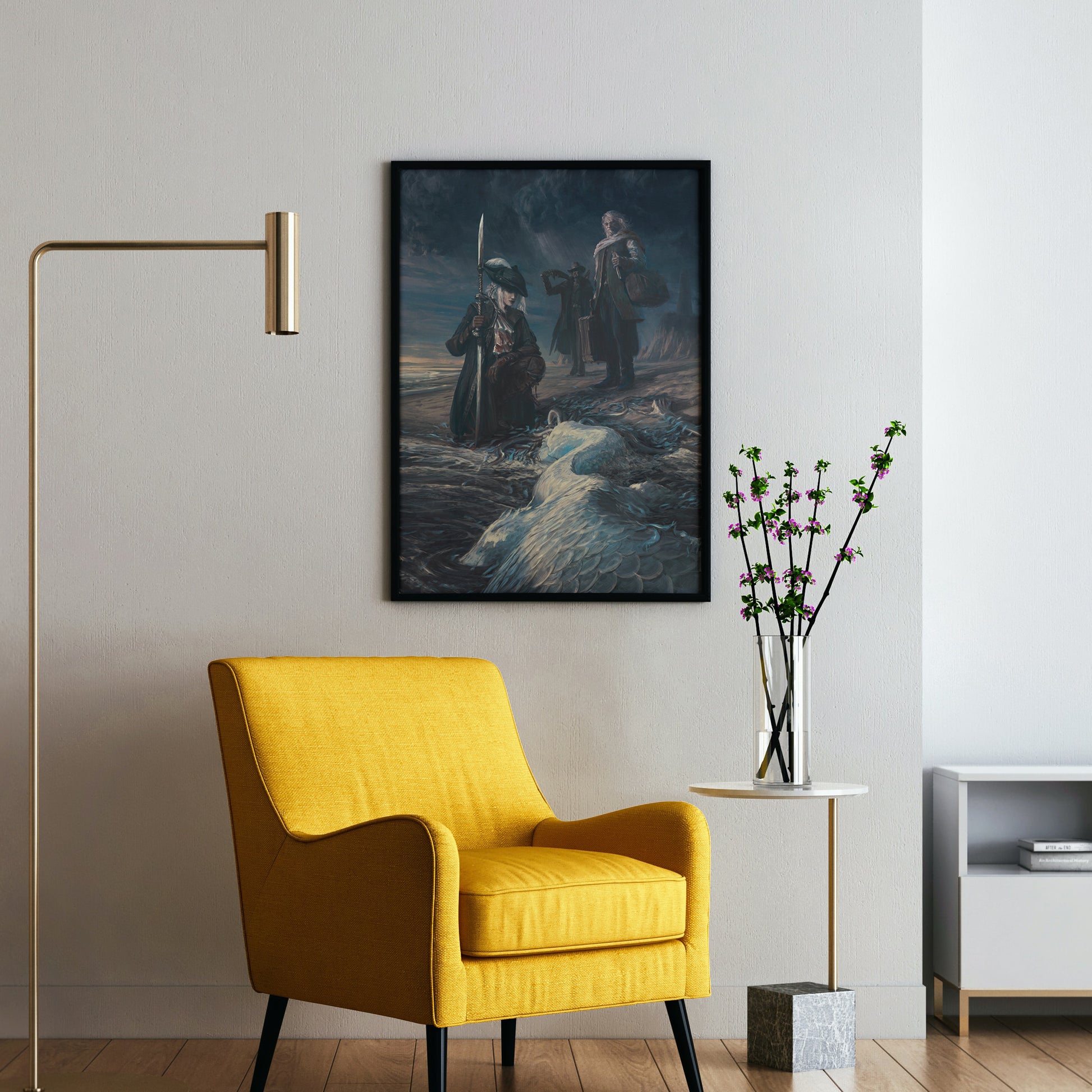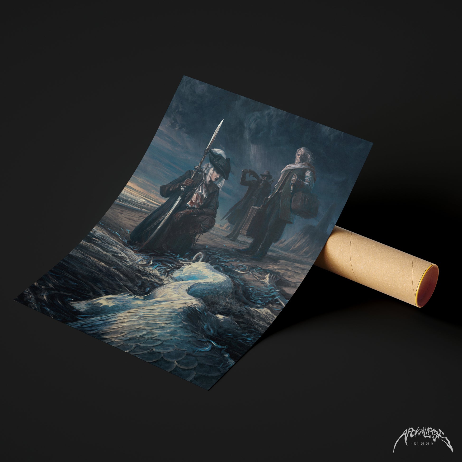 Il poster è dedicato all’artwork del Capitolo 4: Carne. L’artwork ricostruisce il momento (mai mostrato nel gioco) in cui Lady Maria, Gehrman e Lawrence esaminano il cadavere straziato di Kos dopo lo sterminio del Villaggio dei pescatori.