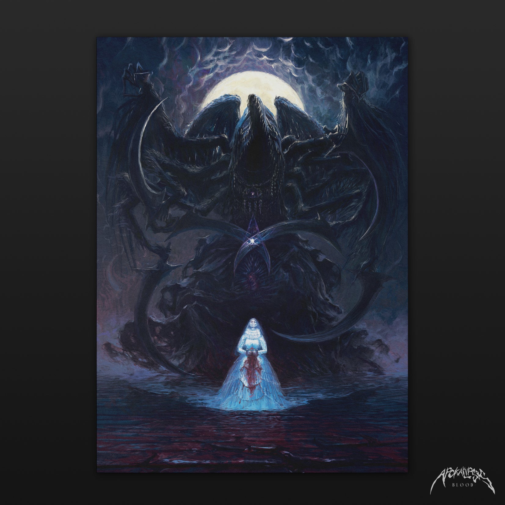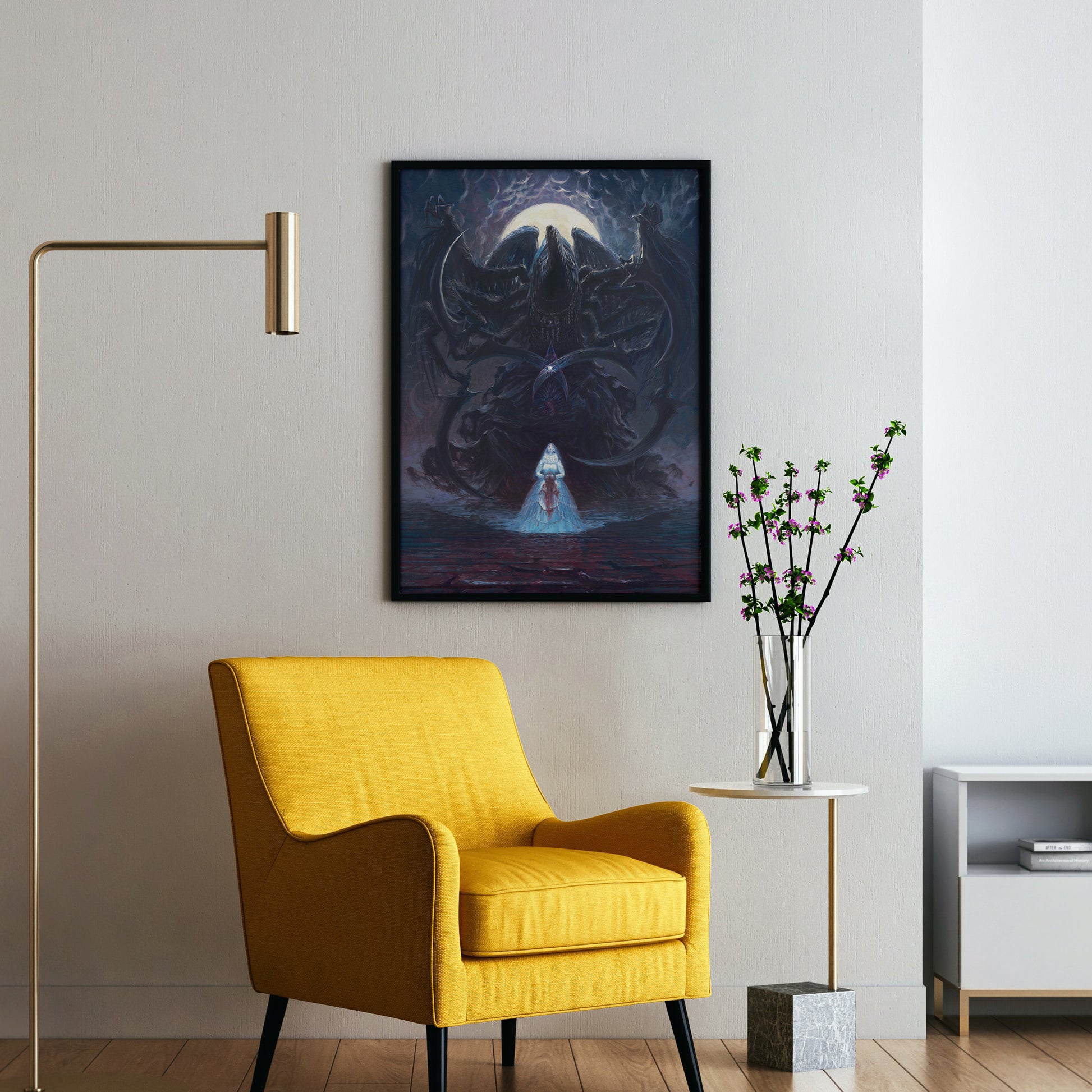 Il poster è dedicato all’artwork del Capitolo 6: Alba. Un Artwork dedicato alle fasi finali di Bloodborne, in cui la regina Yharnam con gli abiti intrisi di sangue è contrapposta alla figura della Balia che torreggia inquietante alle sue spalle.